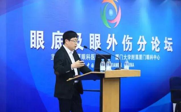 廈門(mén)大學(xué)附屬?gòu)B門(mén)眼科中心眼外傷學(xué)科帶頭人蔡錦紅主任在做“脈絡(luò)膜上腔出血的臨床治療選擇”報(bào)告。