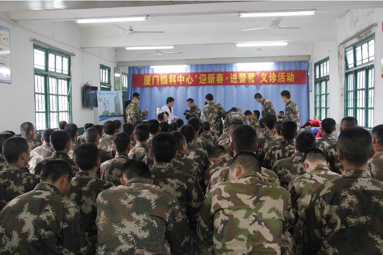 1月29日下午,廈門眼科中心眼表與角膜病專家一行9人冒著冬雨到翔安武警邊防支隊(duì)機(jī)動(dòng)大隊(duì),開展“迎新春 送健康”健康咨詢、義診活動(dòng),并為邊防支隊(duì)武警贈送了進(jìn)口眼藥水。廈門眼科中心以實(shí)際行動(dòng)提前為武警邊防支隊(duì)致以新春祝福與問候,并送去了健康。義診現(xiàn)場氣氛十分熱烈,義診從下午三點(diǎn)半一直持續(xù)到下午六點(diǎn),為近百名武警做了眼體檢。