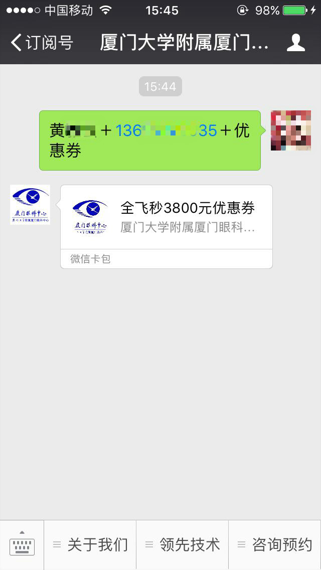 2、在微信公眾號(hào)后臺(tái)回復(fù)“姓名+電話+優(yōu)惠券”,即可點(diǎn)擊領(lǐng)取優(yōu)惠券。