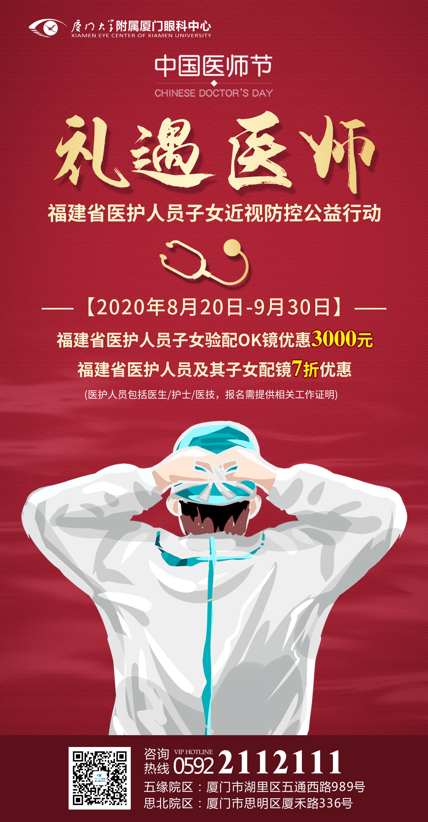 值此醫(yī)師節(jié)到來之際,廈門市衛(wèi)生健康委員會、廈門市醫(yī)師協(xié)會、廈門市衛(wèi)生健康委員會團委聯(lián)合海西晨報發(fā)出“禮遇醫(yī)師”倡議。為響應(yīng)倡議,廈門大學(xué)附屬廈門眼科中心特舉辦福建省“禮遇醫(yī)師”醫(yī)護人員子女近視防控優(yōu)惠活動。