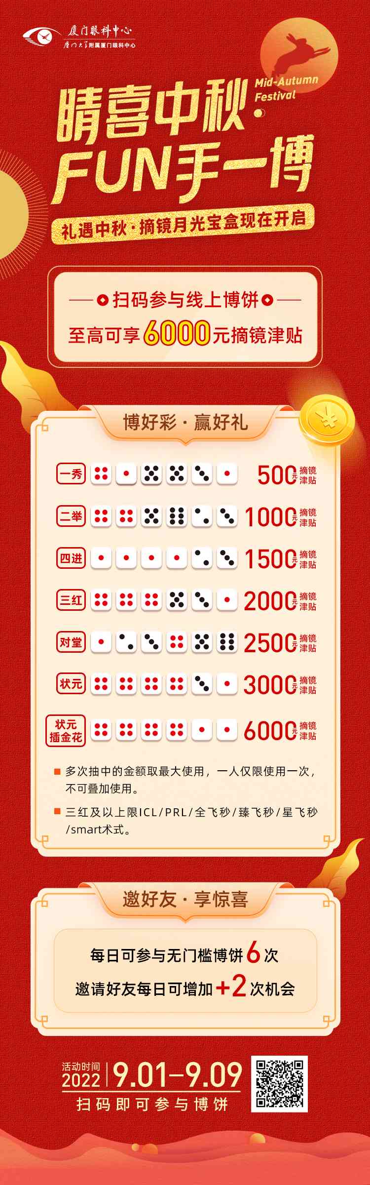 1、活動期間,每人每天有6次博餅機會,成功邀請一位好友參與博餅即可增加2次博餅機會。