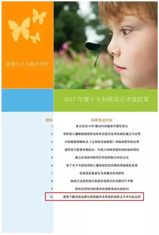 日前,由我院潘美華教授領(lǐng)銜的項(xiàng)目“顯微下睫狀前血管分離保留術(shù)在常規(guī)斜視矯正手術(shù)中的應(yīng)用”成功入選中華醫(yī)學(xué)會斜視與小兒眼科學(xué)組“2017年十大科研亮點(diǎn)”。