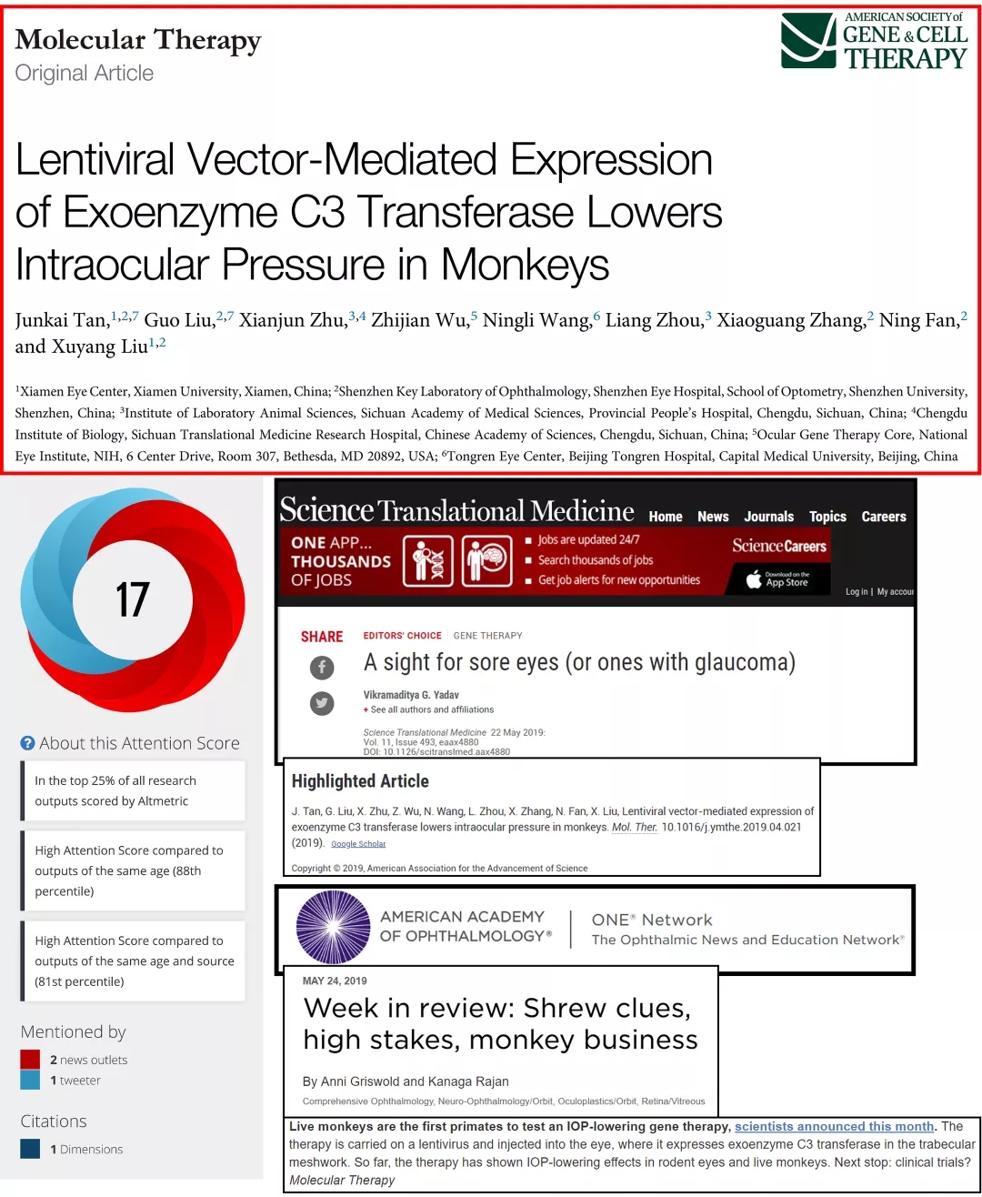 該項研究是以非人靈長類動物恒河猴為實驗對象,應用失活病毒作為載體,將有利于房水排出的基因?qū)牒镅坌×?主要房水排出通道),能引起長達112天的眼壓下降,并且未見不良反應。此前,成功地將功能基因?qū)牒镅坌×航M織并發(fā)揮降眼壓作用尚未見報道。隨即國際雜志《Science Translational Medicine》(影響因子18分)推薦了該篇研究論文,接著美國眼科學會(AAO)官方網(wǎng)站對其進行了報道,兩者均認為此項研究有較好的學術價值和臨床應用前景。目前該篇文章的Altmetric評分(社會化影響力)為17。這是繼近年來年劉旭陽教授團隊在發(fā)表多篇系列研究論文(如去年的美國IOVS雜志)后的又一成果展示,標志著該團隊在青光眼基因治療方面的工作正在穩(wěn)步發(fā)展。目前該團隊的相關工作仍在繼續(xù),比如用改進的基因治療方法已經(jīng)降低猴眼壓達10個月以上,新的文章已經(jīng)投稿,并有望于今年發(fā)表。