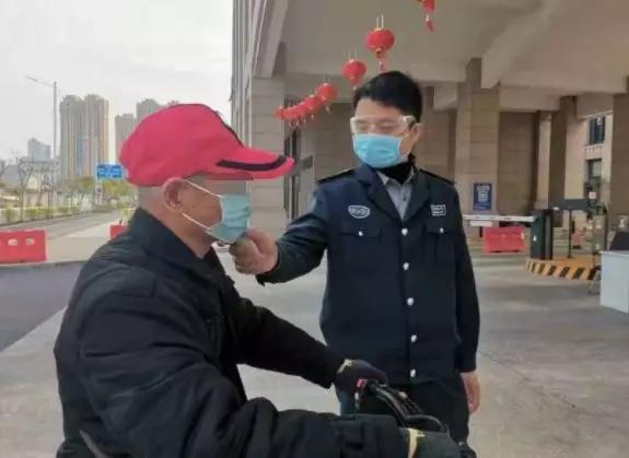 戴上護目鏡、口罩,拿起手中的額溫槍,保安在門崗為入院人員測量體溫,守好崗。