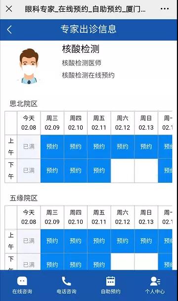預(yù)約步驟:預(yù)約到診-核酸檢測預(yù)約-醫(yī)療機(jī)構(gòu)(廈門大學(xué)附屬廈門眼科中心)-選擇思北/五緣院區(qū)-選擇時(shí)間預(yù)約