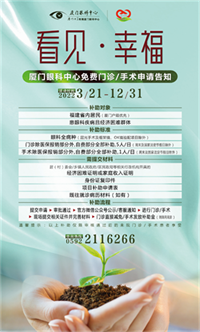 眼睛是心靈之窗,眼健康是國(guó)民健康的重要組成部分,也是反映人民群眾健康和幸福指標(biāo)的一面鏡子。為深化落實(shí)“愛(ài)心廈門”行動(dòng)及內(nèi)涵,提升人民群眾的獲得感、幸福感、安全感,滿足普遍、多樣的眼健康需求,2022年3月21日至12月31日,廈門眼科中心暖心啟動(dòng)2022年“看見(jiàn)幸福”眼健康愛(ài)心公益項(xiàng)目,聚焦弱勢(shì)群體及重點(diǎn)眼病的困難救治,凡符合條件的患者均可申請(qǐng)專項(xiàng)愛(ài)心公益補(bǔ)助。