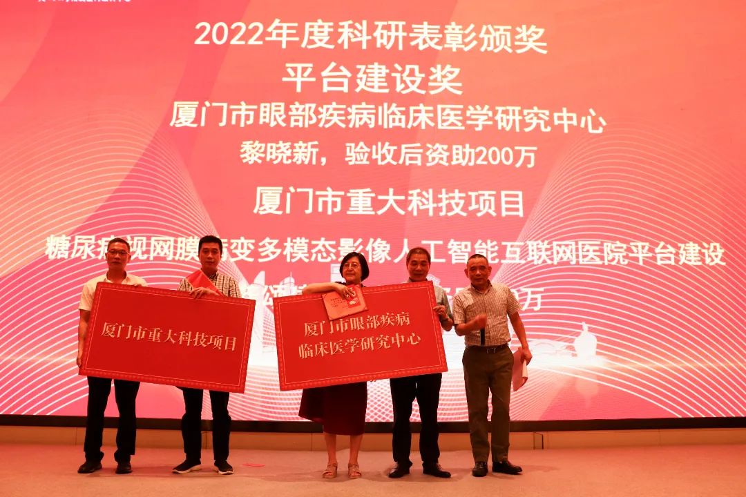 會上,2022年度科研表彰頒獎盛典同步舉行。2022年度,我院科研工作再結碩果,醫(yī)院學術品牌的影響力和號召力得到進一步提升。我院獲批成為廈門市眼部疾病臨床醫(yī)學研究中心,榮登2022年度中國醫(yī)院科技量值(眼科學)榜單,并連續(xù)十年衛(wèi)冕福建省眼科學第 一,實力領跑。