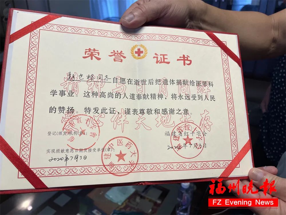 當晚9時多,按照其遺愿,他如愿以償,捐獻有用的器官——眼角膜,并“坐”上開往福建中醫(yī)藥大學的車子,成為一名大體老師(醫(yī)學界對遺體捐贈者的尊稱)。