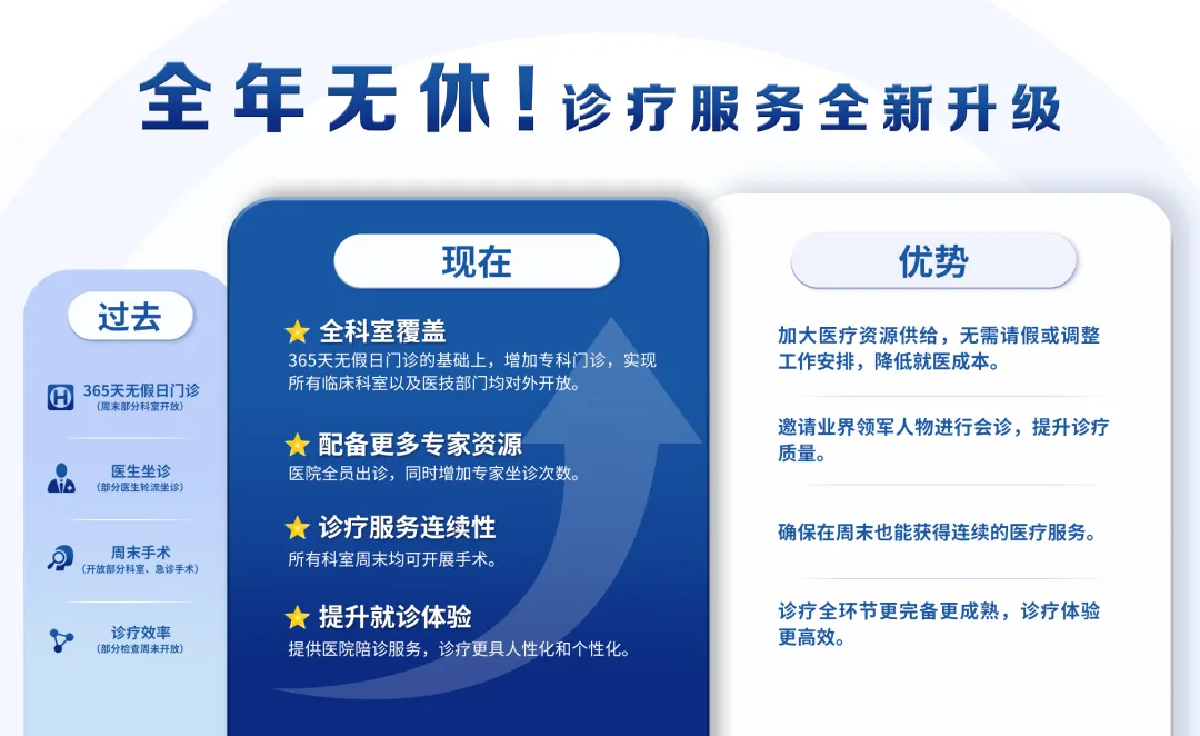 通過(guò)實(shí)施“無(wú)假日門(mén)診,診療再升級(jí),周末開(kāi)通門(mén)診”的組合方案,醫(yī)院可以在時(shí)間和服務(wù)質(zhì)量上雙重提升,確?;颊咴谌魏螘r(shí)間都能獲得高質(zhì)量的醫(yī)療服務(wù)。這不僅提高了患者的就診體驗(yàn),也增強(qiáng)了醫(yī)院的整體競(jìng)爭(zhēng)力和服務(wù)水平,真正實(shí)現(xiàn)就醫(yī)無(wú)障礙,看病無(wú)需再請(qǐng)假,周末也能看醫(yī)生!