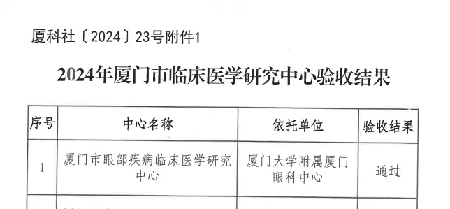 廈門眼科中心閃耀“【文章導(dǎo)讀】日前,廈門市科學(xué)技術(shù)局對(duì)廈門市5家疾病臨床醫(yī)學(xué)研究中心開展了驗(yàn)收,經(jīng)過層層嚴(yán)格評(píng)選、現(xiàn)場(chǎng)答辯和實(shí)地考察后,我院建設(shè)的眼部疾病臨床醫(yī)學(xué)研究中心成功通過驗(yàn)收! 廈門市眼