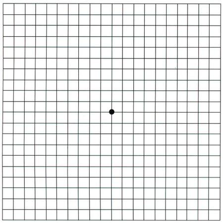 有一種簡(jiǎn)單且能夠及早發(fā)現(xiàn)老年性黃斑變性的方法,叫做阿姆斯勒方格(如下圖)。這是一個(gè)打印的正方形的小格子,類似于棋盤格,尺寸一般是15厘米X15厘米?;颊呖梢园阉N在冰箱上,每隔一周擋住一側(cè)眼睛看一看,如果發(fā)現(xiàn)自己任何一側(cè)的眼睛看到格子變形了,就需要來(lái)看醫(yī)生了。