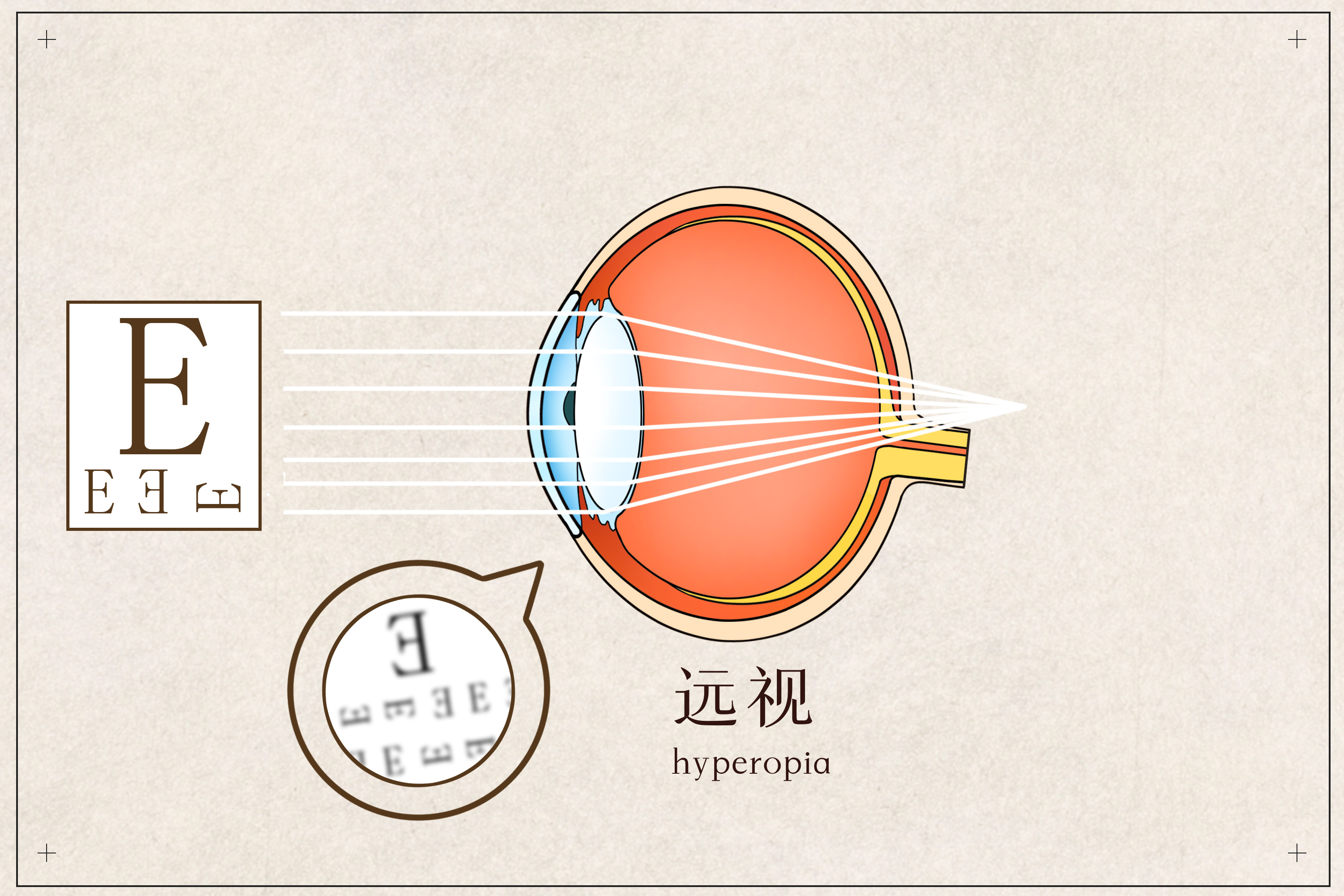 遠(yuǎn)視是指平行光線進(jìn)入眼內(nèi),經(jīng)過眼球屈光系統(tǒng)(角膜、房水、晶狀體、玻璃體)的折射,在視網(wǎng)膜后方聚焦,導(dǎo)致視網(wǎng)膜上的成像模糊不清,稱為遠(yuǎn)視眼。
