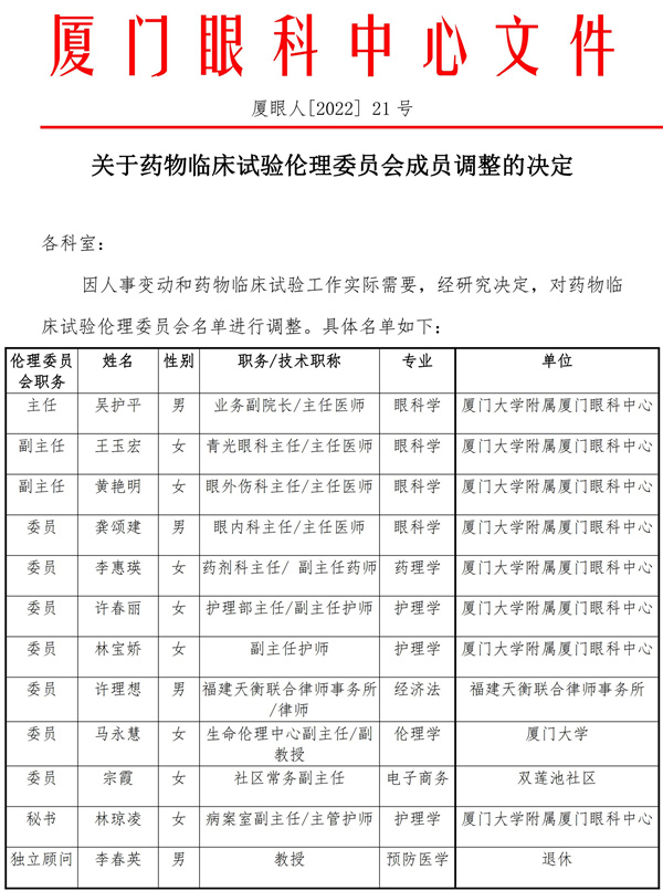 關(guān)于藥物臨床試驗(yàn)倫理委員會(huì)成員調(diào)整的決定